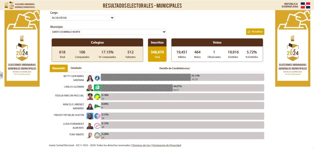 SANTO DOMINGO.-La Junta Central Electoral emitió su primer boletín en el que la candidata a la alcaldía del municipio Santo Domingo Norte Betty Gerónimo Santana, del Partido Revolucionario Moderno y aliados, salió en la delantera con 55.11 por ciento de los votos válidos emitidos y Carlos Guzmán, de la Fuerza del Pueblo, le sigue con 44.07 por ciento.