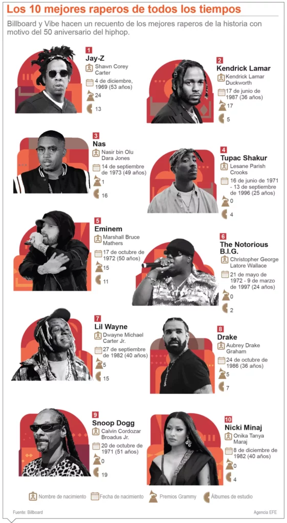 Billboard y Vibe se unieron para clasificar a los 50 mejores raperos de todos los tiempos como parte de su saludo al aniversario de oro del hip hop este año.