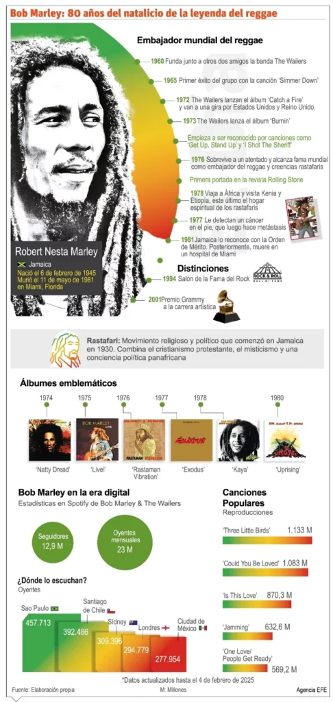 Nueva York.-Bob Marley, un músico admirado por varias generaciones de todo el mundo, estaría cumpliendo este 6 de febrero ochenta años, y aunque su presencia ya no está, su aportación al movimiento rastafari y al reggae lo mantienen vigente en la actualidad, tras haberse posicionado como símbolo de los oprimidos.