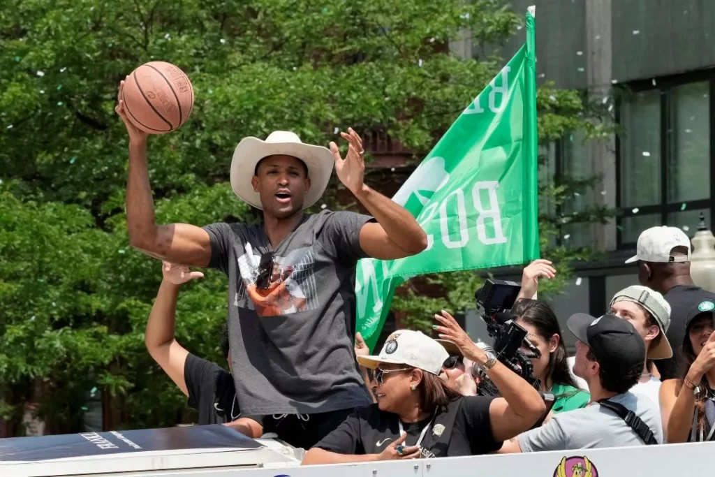 El veterano dominicano Al Horford, con sombrero vaquero, también sostenía en los brazos a una de sus hijas, a la que dejó posteriormente para celebrar junto a su padre, el exbaloncestista Tito Horford y seguidor número uno que no se pierde un partido en el TD Garden.