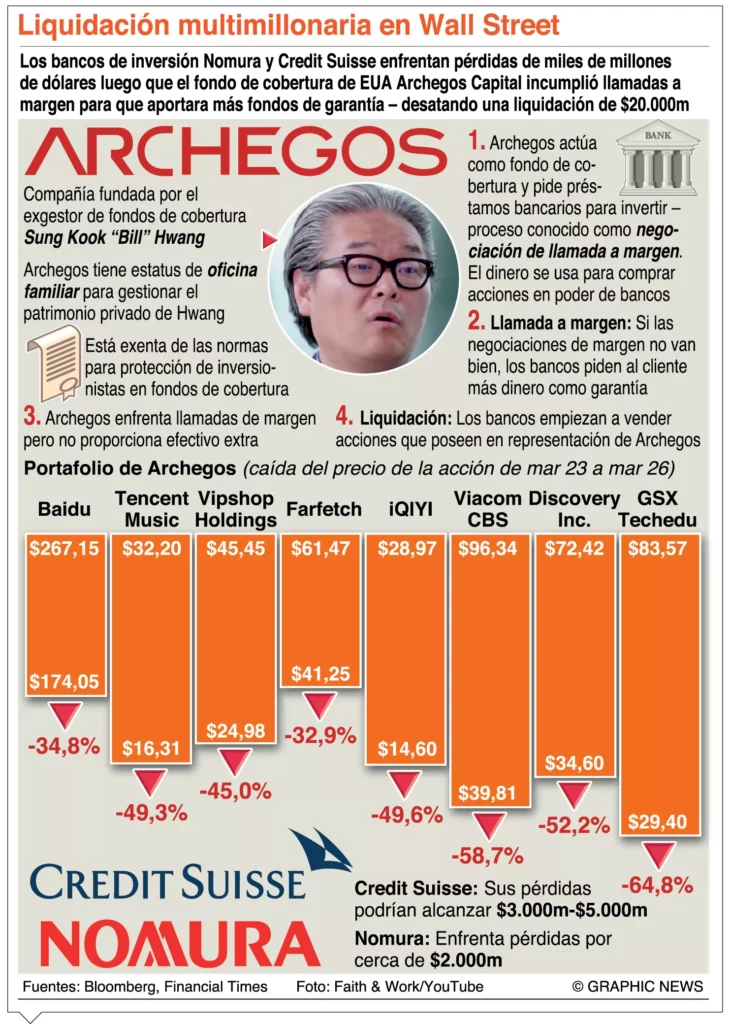 El escándalo por la liquidación del fondo Archegos sigue extendiéndose entre los bancos de inversión en Nueva York, Tokio y Zurich, aunque es el banco Credit Suisse el que podría tener que asumir las mayores pérdidas por las operaciones del “hedge fund” de Hwang.