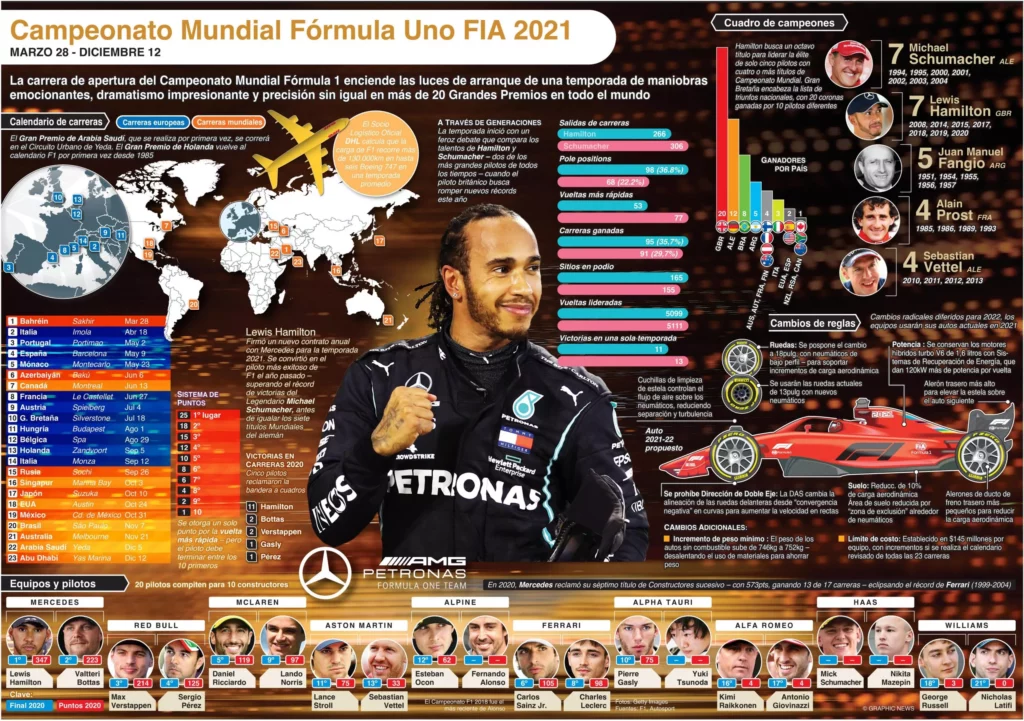 Marzo 28, 2021 – Diciembre 12, 2021 – La 72º edición del Campeonato Mundial Fórmula Uno ahora inicia con el Gran Premio de Bahréin y concluye en Abu Dhabi en diciembre.