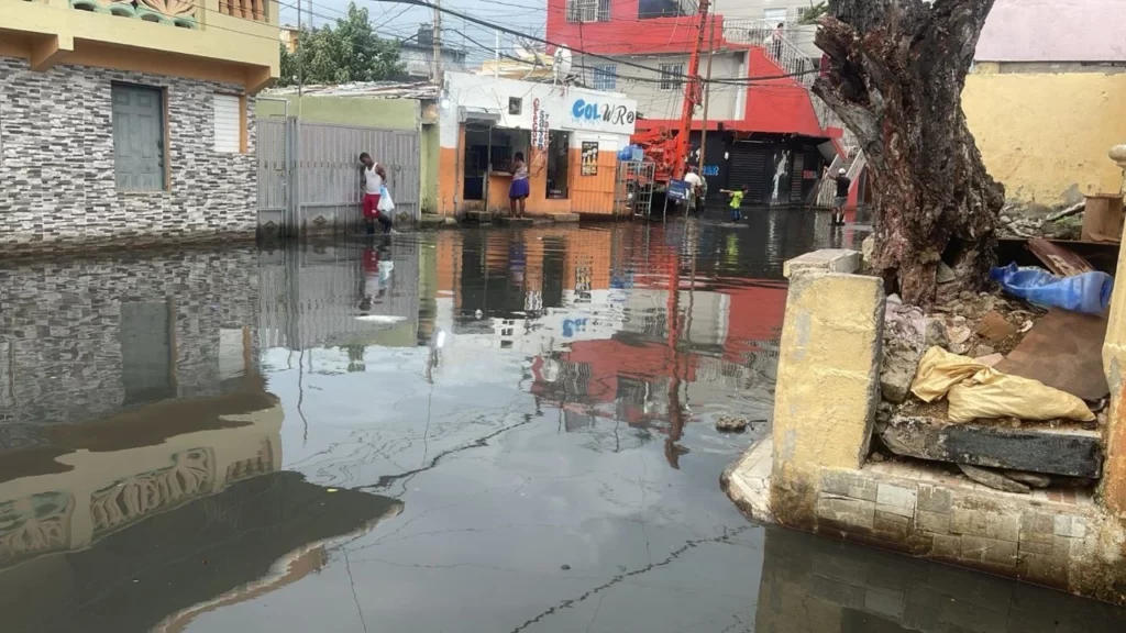 Santo Domingo Este. – Residentes de la calle Primera del sector Maquiteria denunciaron que llevan más de una semana “con el agua al cuello” debido a una inundación que mantiene anegadas viviendas y negocios en la zona.