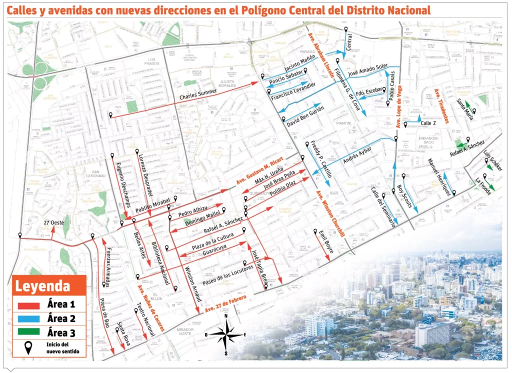 SANTO DOMINGO.-El cambio de dirección de 42 vías del Polígono Central Ampliado, aprobado por el Consejo de Regidores del Ayuntamiento del Distrito Nacional en la ordenanza 7/2020 implica establecer los parqueos sólo en el mismo sentido de la calle.