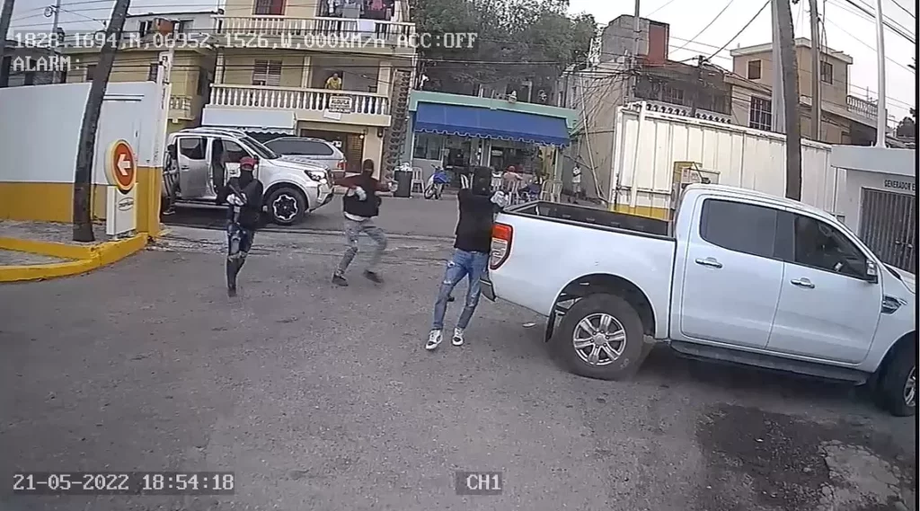 A través de un video de tres minutos y cinco segundos se puede observar cuando los seis asaltantes, tres de ellos con armas cortas y otros dos con armas largas, penetran al negocio y dos de ellos disparan sus armas, mientras que otros dos se abalanza contra los presentes allí, incluyendo el vigilante del lugar, uno se queda vigilando la puerta de acceso y el conductor permanece dentro de la camioneta.
