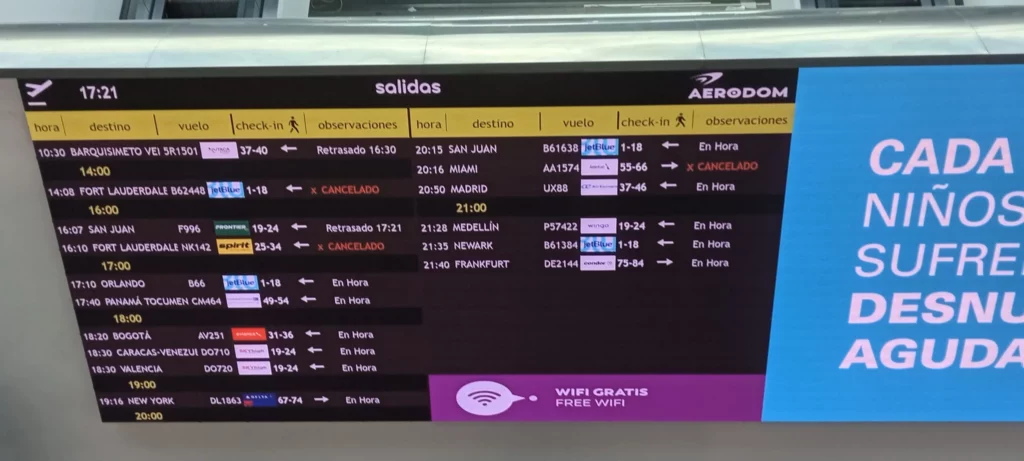 Las aerolíneas afectadas que operan desde el Aeropuerto Internacional de Las Américas, José Francisco Peña Gómez, incluyen American Airlines, Frontier Airlines, JetBlue Airways y Spirit Airlines.