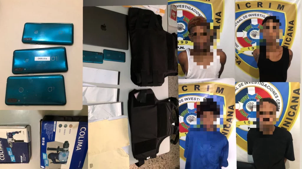 Los miembros investigativos, mediante labores de inteligencia, arrestaron por estos hechos delictivos a Sebastián Gutiérrez, de 19 años; Jhoan Alberto Mella (a) Joan el Grande, de 18, buscado mediante la orden de arresto No. 973-2024-EMES-07850, por violar el artículo 379 del Código Penal, Michael Montero Vicente, de 22, y un menor de edad.