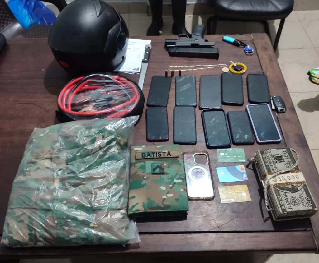 Al momento de su localización en una estación de combustible del sector La Minita, en Villa Sonador, se les incautaron cuatro teléfonos celulares, una pistola con su cargador y tres cápsulas, RD$10,110 en efectivo, tarjetas bancarias, dos cadenas, un casco protector, una cartera tipo monedero y otros artículos personales. El vehículo en el que se desplazaban era un KIA K5 gris, placa AA36154.