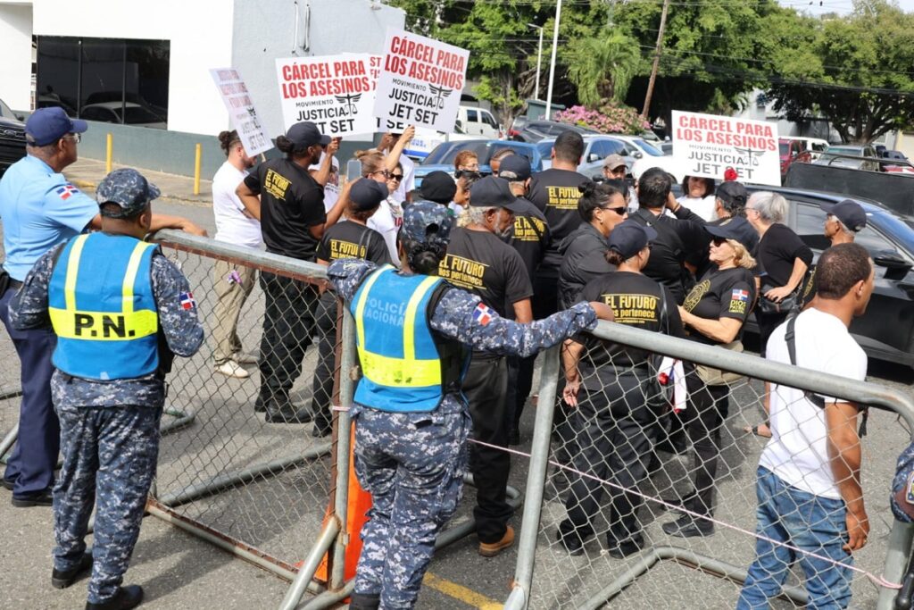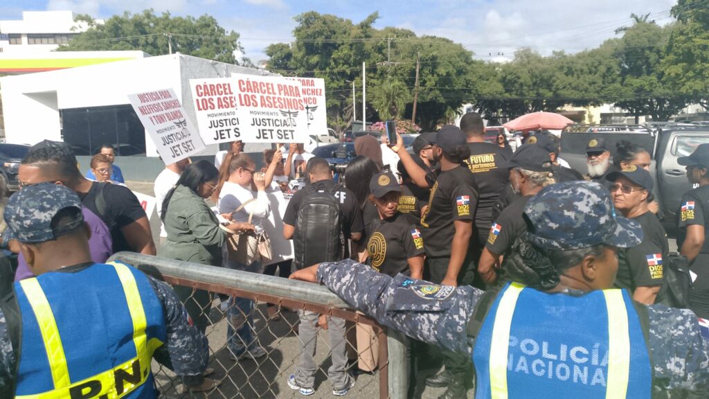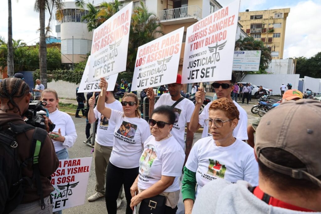 Santo Domingo.- Portando pancartas con consignas como “cárcel para los asesinos”, ciudadanos algunos vestidos de blanco y otros de negro se concentran en las inmediaciones del Palacio de Justicia de Ciudad Nueva, en el Distrito Nacional, donde se conoce la audiencia preliminar contra los hermanos Antonio y Maribel Espaillat, propietarios de la discoteca Jet Set Club.