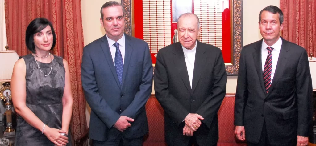 El candidato presidencial Luis Abinader junto con su esposa Rachel Arbaje de Abinader y el presidente en funciones del PRM, Orlando Jorge Mera, sostuvieron ayer un encuentro con el cardenal López Rodríguez, en el Arzobispado, donde trataron diversos temas.