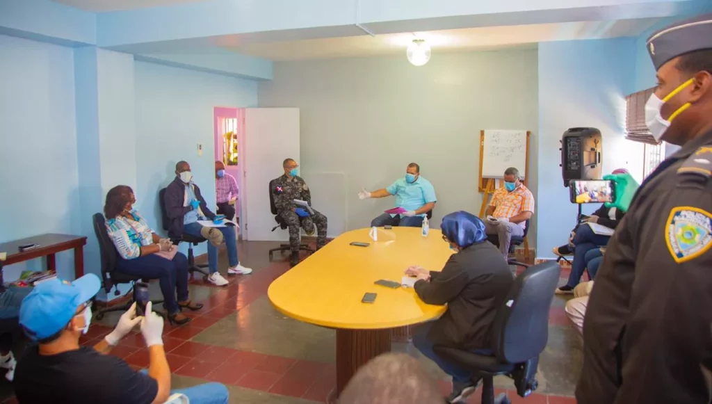 La reunión de trabajo en la lucha contra el COVID-19 en el municipio, se realizó en el Salón de Conferencia del Área 3 de Salud Pública de Santo Domingo Norte utilizando todas las medidas preventivas recomendada por el MSP, como son el uso de mascarillas, guantes y manteniendo la distancia física entre los presentes.