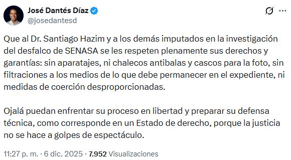 “Que al Dr. Santiago Hazim y a los demás imputados en la investigación del desfalco de SENASA se les respeten plenamente sus derechos y garantías: sin aparatajes, ni chalecos antibalas y cascos para la foto, sin filtraciones a los medios de lo que debe permanecer en el expediente, ni medidas de coerción desproporcionadas. Ojalá puedan enfrentar su proceso en libertad y preparar su defensa técnica, como corresponde en un Estado de derecho, porque la justicia no se hace a golpes de espectáculo.”, expresó.