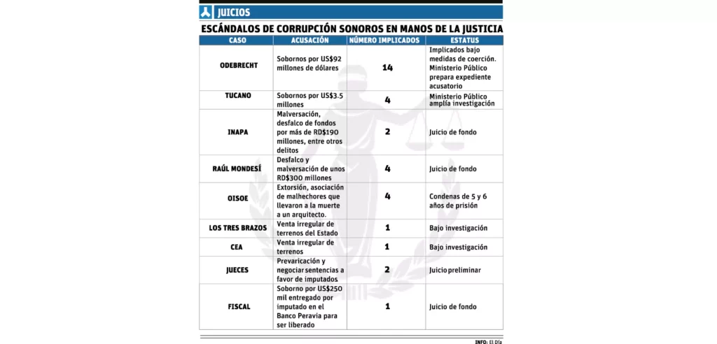 Santo Domingo.-Aunque Odebrecht se ha convertido en el caso de corrupción más famoso, la Justicia dominicana tiene en sus manos al menos 8 expedientes sonoros que envuelven grandes delitos, algunos de los cuales se encuentran en juicio de fondo o en preliminares.