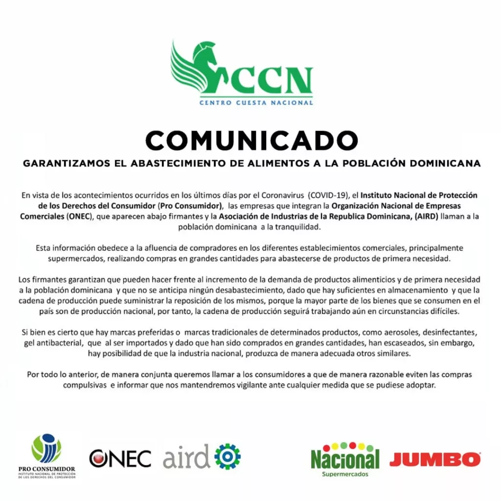 Garantizan que pueden hacer frente al incremento de la demanda de productos alimenticios y de primera necesidad a la Población dominicana y que no se anticipa ningún desabastecimiento.