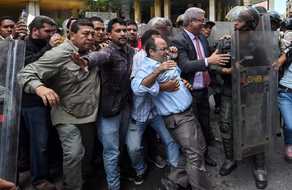 Policías y militares, que custodiaban el edificio, lanzaron gases para dispersar a los manifestantes, mientras que militantes chavistas agredieron con palos a Julio Borges, jefe de la bancada parlamentaria de la coalición opositora Mesa de la Unidad Democrática (MUD, mayoritaria).