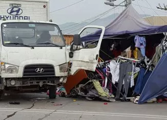 El hecho ocurrió a media mañana del jueves cuando el camión eludió a un vehículo policial y en su loca carrera arrasó los puestos de venta, dijo Murillo.