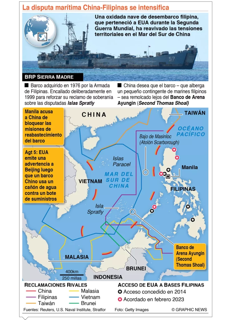 El portavoz acusó a Filipinas de “violar sus compromisos” y tratar de “ocupar permanentemente” el arrecife, lo que “viola la soberanía china” y la “Declaración sobre la Conducta de las Partes en el de Marzo del Sur de China (DOC), firmada por China y los países miembros de la Asociación de Naciones del Sudeste Asiático (ASEAN) en 2002. China tomará las medidas necesarias para salvaguardar firmemente la soberanía nacional”, afirmó Wu, recogió anoche la agencia estatal Xinhua.