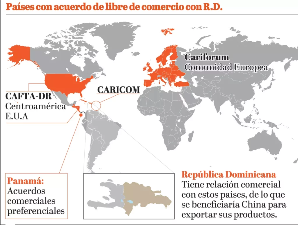SANTO DOMINGO.-La estratégica ubicación geográfica y los múltiples acuerdos de libre comercio suscritos con diferentes países y bloques, convierten a República Dominicana en un mercado atractivo para las industrias chinas que quieran colocar sus productos en América y Europa.