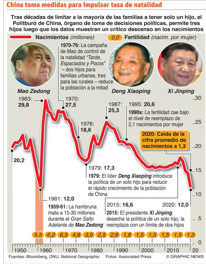 En 2020, la cifra de nacimientos cayó por cuarto año consecutivo, con 12 millones frente a los 14,65 de 2019, mientras que la tasa de fertilidad quedó en 1,3 hijos por mujer, por debajo del 2,1 estimado por Naciones Unidas para mantener una población estable.