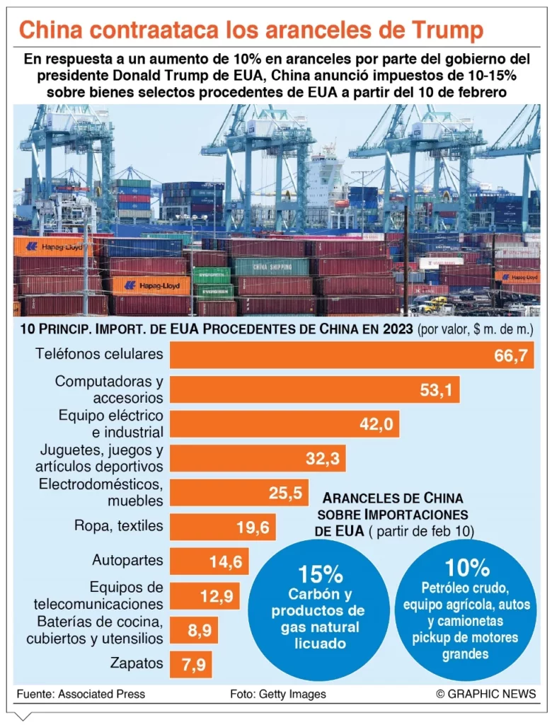 Pekín respondió con firmeza con tarifas selectivas que afectan a productos como el petróleo, el gas licuado, la maquinaria y los automóviles de gran cilindrada, además de lanzar una investigación contra la gigante estadounidense Google y anunciar controles de exportación a minerales críticos.