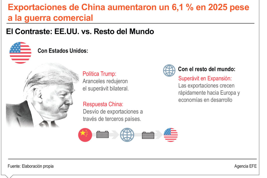 Shanghái, China.-El valor denominado en yuanes de las exportaciones chinas al resto del mundo aumentó un 6,1 % en 2025 hasta unos 26,99 billones de yuanes (3,87 billones de dólares, 3,32 billones de euros) pese al impacto del recrudecimiento de la guerra comercial con Estados Unidos y las tensiones con otros territorios.