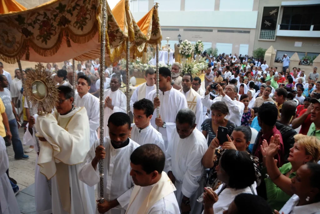 SANTO DOMINGO.- Cientos de feligreses católicos desafiaron el radiante sol la tarde de este jueves recorriendo parte de la Zona Colonial de Santo Domingo durante la procesión con motivo de la celebración del Día de Corpus Christi.