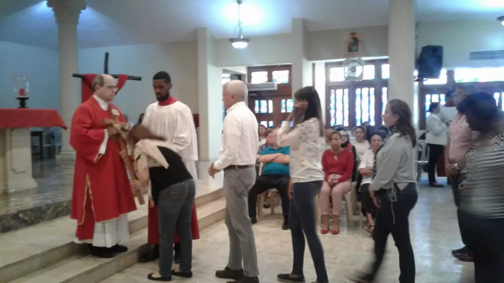 Santo Domingo. Cientos de feligreses de la parte baja de la ciudad se dieron cita en la Parroquia Jesús Maestro en el sector del mismo nombre, para participar en los actos conmemorativos de la adoración a Jesús en la cruz.