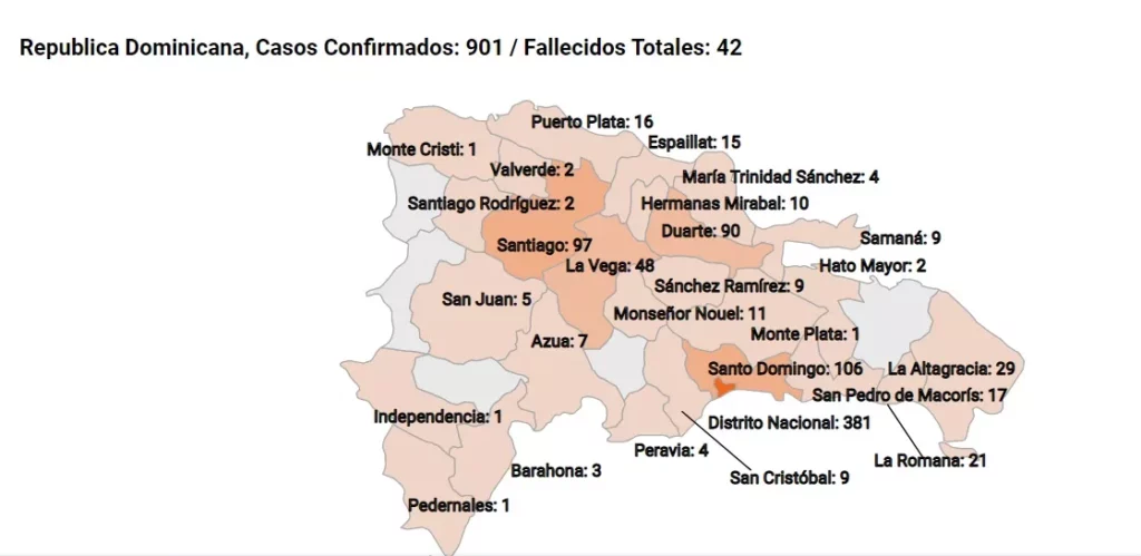SANTO DOMINGO.-El Distrito Nacional encabeza la lista de contagios por el Covid-19 con 381 de los 901 casos confirmados por el Ministerio de Salud Pública, donde el casco urbano concentra el mayor foco de infestación, sin embargo el porcentaje de muertes es el 1% de las 42 ocurridas.