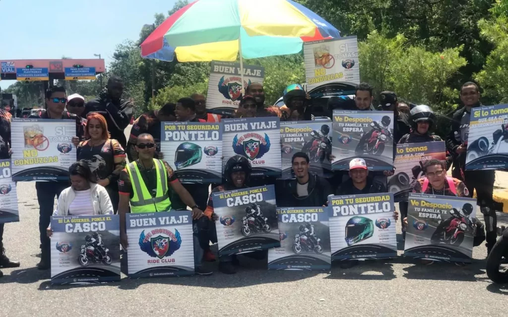 Santo Domingo. – El circulo de motociclistas The Brothers Ride Club, integrado por más 80 miembros, inició hoy en el peaje de la Autopista 6 de Noviembre una campaña de concientización sobre el uso adecuado del casco de seguridad y otros componentes de protección que deben utilizar los usuarios de este tipo de vehículos para transitar en las calles, carreteras y otras vías.