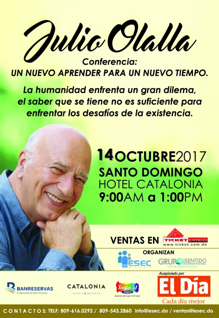Santo Domingo.-El Coaching Ontológico Julio Olalla dictará la conferencia "Un nuevo aprender para un nuevo tiempo", en la que planteará cómo la humanidad enfrenta un nuevo dilema donde el saber que se tiene no es suficiente para enfrentar los desafíos de la existencia.