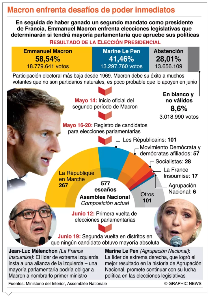 En tanto, el Consejo Constitucional, organismo que supervisa el cumplimiento de la Constitución francesa, validó ayer la reelección del presidente Emmanuel Macron en las presidenciales francesas del 24 de abril.