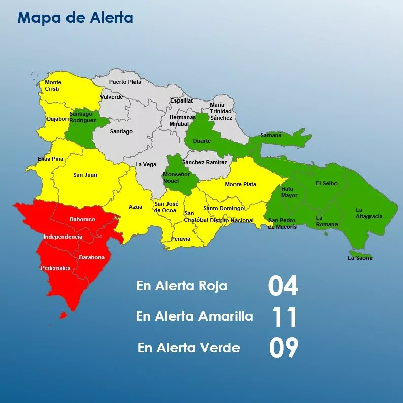 Por tanto, las provincias en alerta roja son: Barahona, Pedernales, Independencia, Bahoruco.