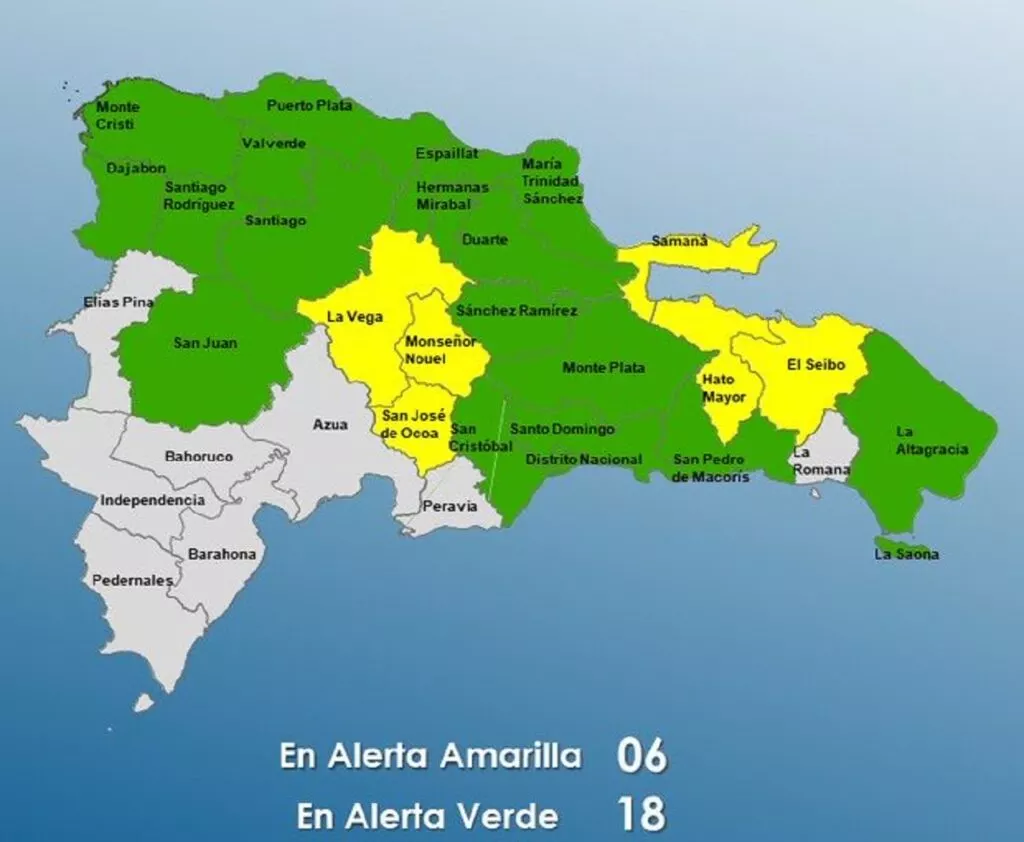 Las provincias en alerta amarilla son La Vega, Monseñor Nouel, Samaná, San José de Ocoa, El Seibo y Hato Mayor.
