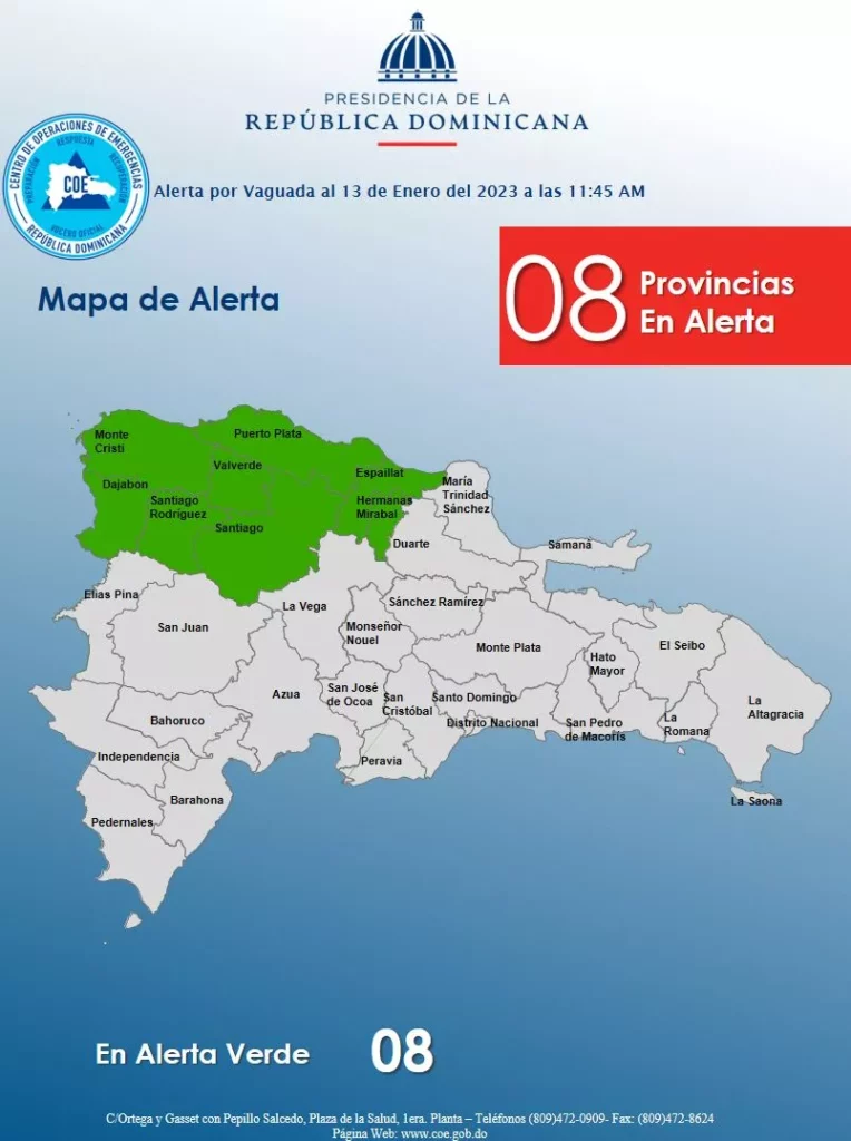 Santo Domingo.- El Centro de Operaciones de Emergencia (COE) aumenta a ocho las provincias en alerta verde ante posibles crecidas de ríos, arroyos y cañadas, así como inundaciones repentinas o urbanas, debido a la incidencia de una vaguada generará precipitaciones.