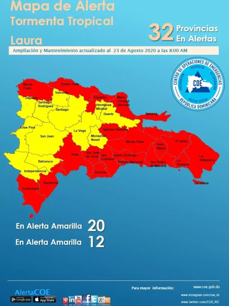 Las provincias en alerta roja son La Altagracia, Samaná, San Pedro de Macoris, Hato Mayor, El Seibo, San José de Ocoa, Azua, Barahona, Pedernales, Puerto Plata, Montecristi, Espaillat, María Trinidad Sánchez, San Cristóbal, La Romana, Monte Plata, Peravia, Sánchez Ramírez, Distrito Nacional y Santo Domingo.