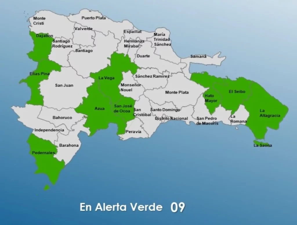 El COE amplió el nivel de alerta por posibles crecidas de ríos, arroyos y cañadas, así como inundaciones repentinas o urbanas, en las provincias La Altagracia, La Vega, Elías Piña, El Seibo, Hato Mayor, Dajabón, Azua, San José de Ocoa y Pedernales.