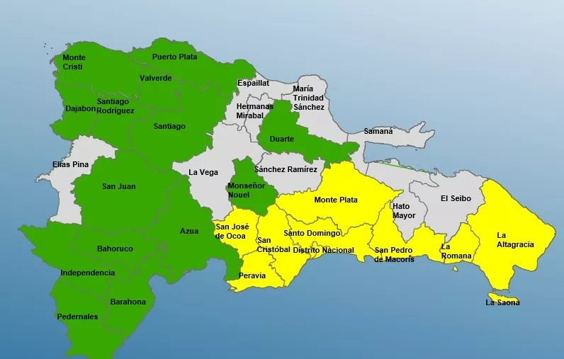 Mientras que en verde se encuentran: Duarte, Independencia, Puerto Plata, Santiago Rodríguez, Azua, Montecristi, Bahoruco, Santiago, Barahona, Valverde, Dajabón, San Juan y Pedernales siendo un total de 13 provincias en bajo el nivel de alerta verde y un total de 23.