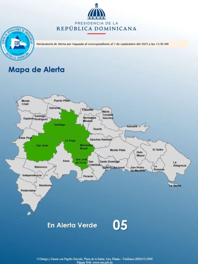 El COE informó que las localidades en vigilancia son Santiago, Monseñor Nouel, San José de Ocoa, San Juan y La Vega.