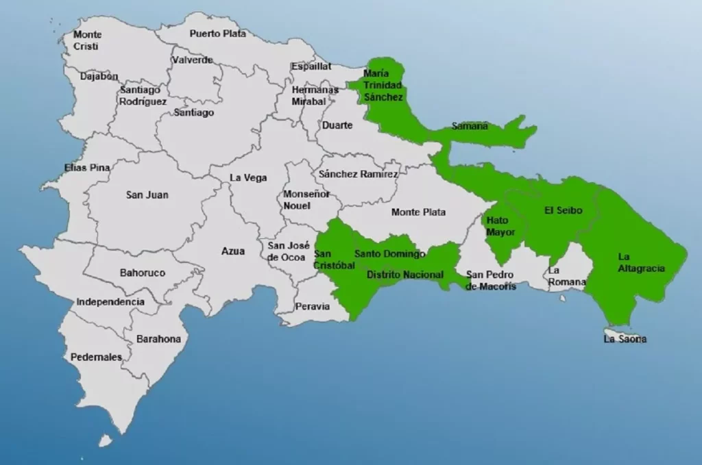 Las provincias en alerta son: Hato Mayor, El Seibo, Monte Plata y San Pedro de Macorís, María Trinidad Sánchez, Hato Mayor, San Cristóbal, El Seibo, Santo Domingo, La Altagracia, Samaná y El Distrito Nacional.