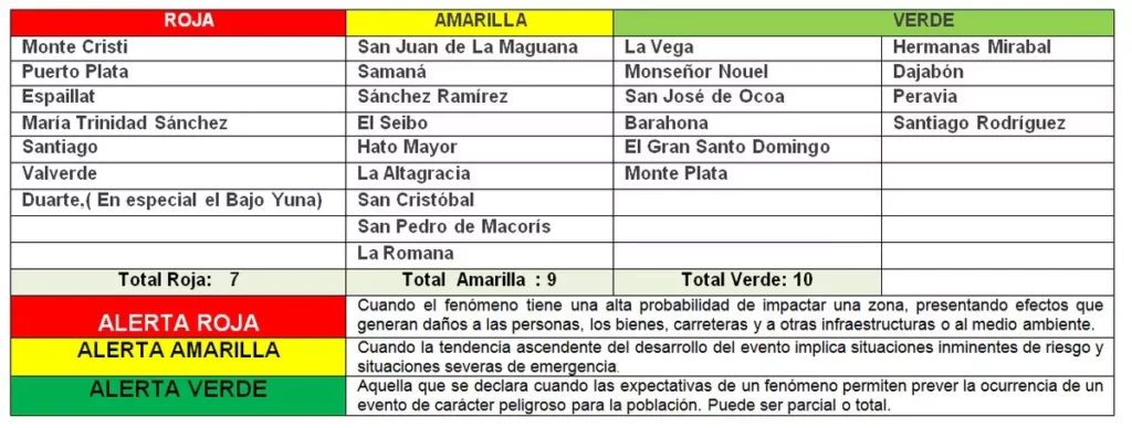 En alerta roja están Montecristi, Puerto Plata, Espaillat, María Trinidad Sánchez, Santiago, Valverde y Duarte,( En especial el Bajo Yuna).