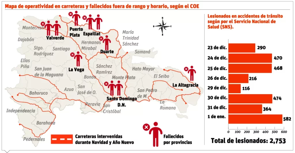 SANTO DOMINGO.-El director del Centro de Operaciones de Emergencias (COE), general Juan Manuel Méndez, admitió que ese organismo no ofreció dentro de su informe final al menos diez casos de muertes por accidentes de tránsito registradas durante Navidad y Año Nuevo, alegando que no se circunscribieron dentro del rango, horario o período de su operativo.
