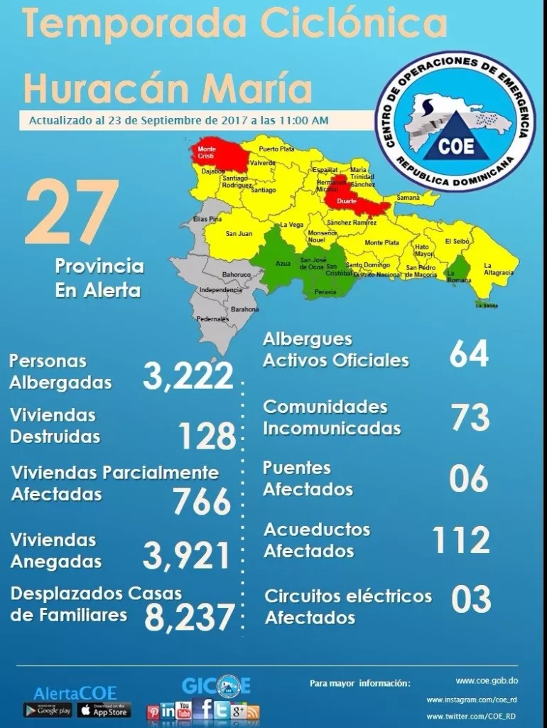 Asimismo, el COE reportó 3, 921 viviendas anegadas, 128 destruidas y 112 acueductos afectados, producto de los efectos del huracán María a su paso por el país.