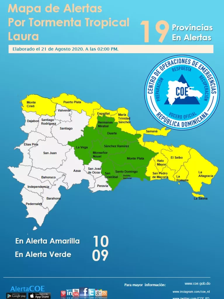 Ante los posibles efectos sobre el territorio nacional de la tormenta tropical Laura, el COE puso en alerta amarilla están las provincias La Altagracia, María Trinidad Sánchez, Espaillat, La Romana, San Pedro de Macorís, Montecristi, El Seibo, Samaná, Puerto Plata y Hato Mayor.