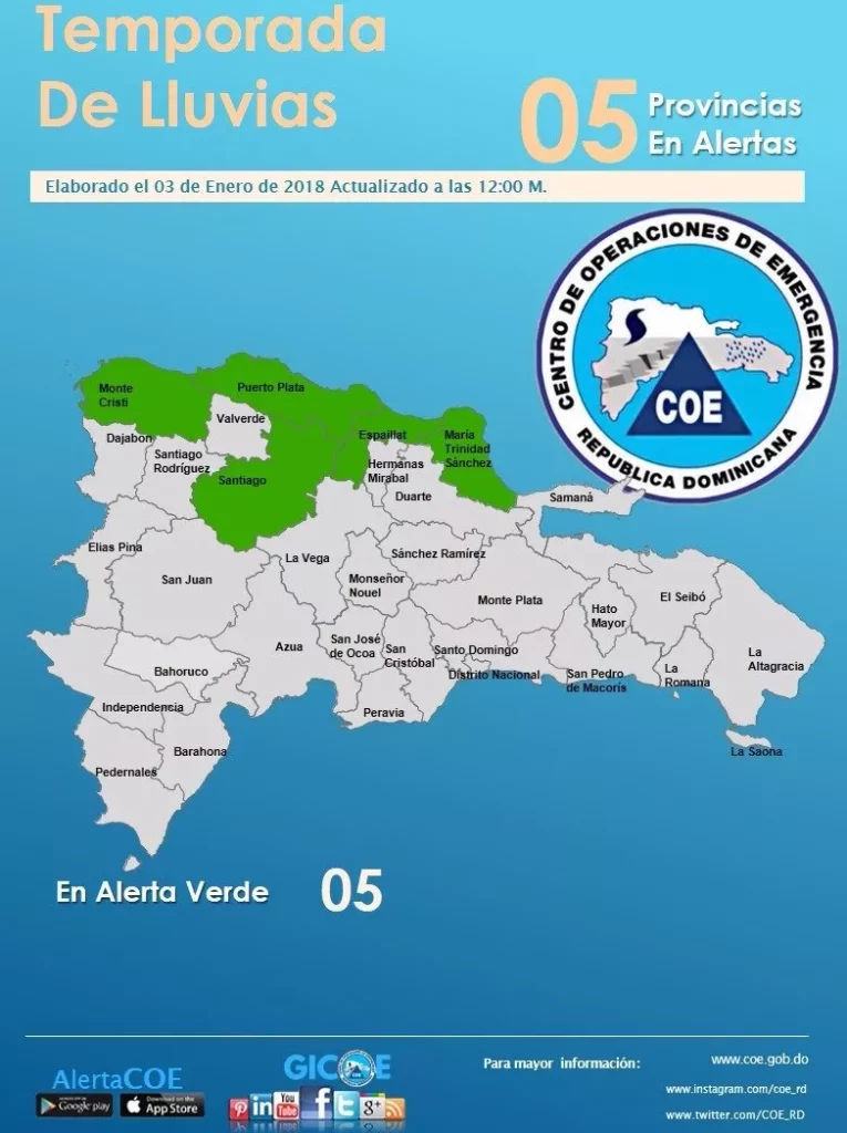 Santo Domingo.- El Centro de Operaciones de Emergencias (COE), emite alerta verde en cinco provincias por posibles inundaciones repentinas urbanas y rurales, crecidas de ríos arroyos y cañadas, así como deslizamientos de tierra.