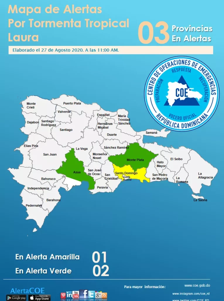 En alerta amarilla se encuentra la provincia Santo Domingo, solo para la ribera del Ozama. Mientras que, en verde se encuentran Azua y Monte Plata.
