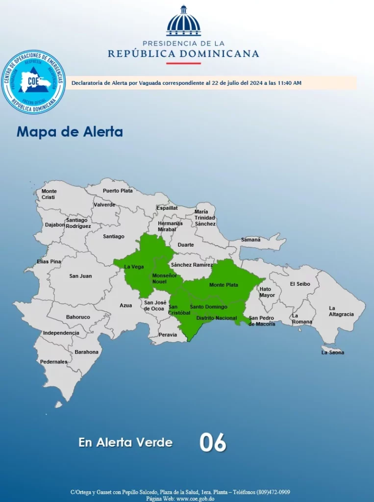 Las provincias en alerta verde son: La Vega, Monseñor Nouel, Monte Plata, San Cristóbal, Santo Domingo y el Distrito Nacional.