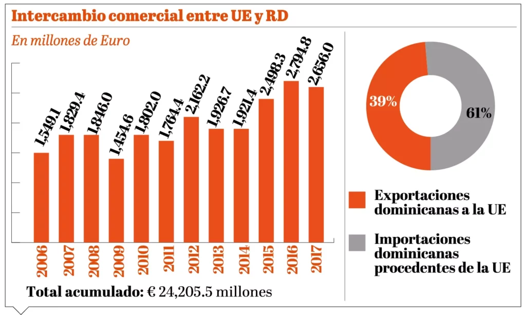 Según datos del Eurostat, suministrados por la embajada dominicana en Bélgica, en términos absolutos, España es el principal socio comercial del país en la UE, con un comercio total de € 614.2 millones en 2017 (23 % del total comercializado).