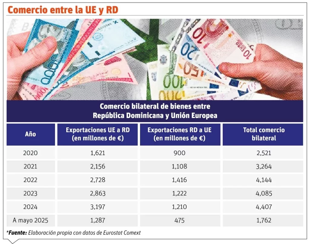 Solo en los primeros cinco meses de 2025, señala que el intercambio comercial totalizó 1,762 millones de euros, siendo 1,287 millones provenientes de la UE y 472 millones enviados desde el país.