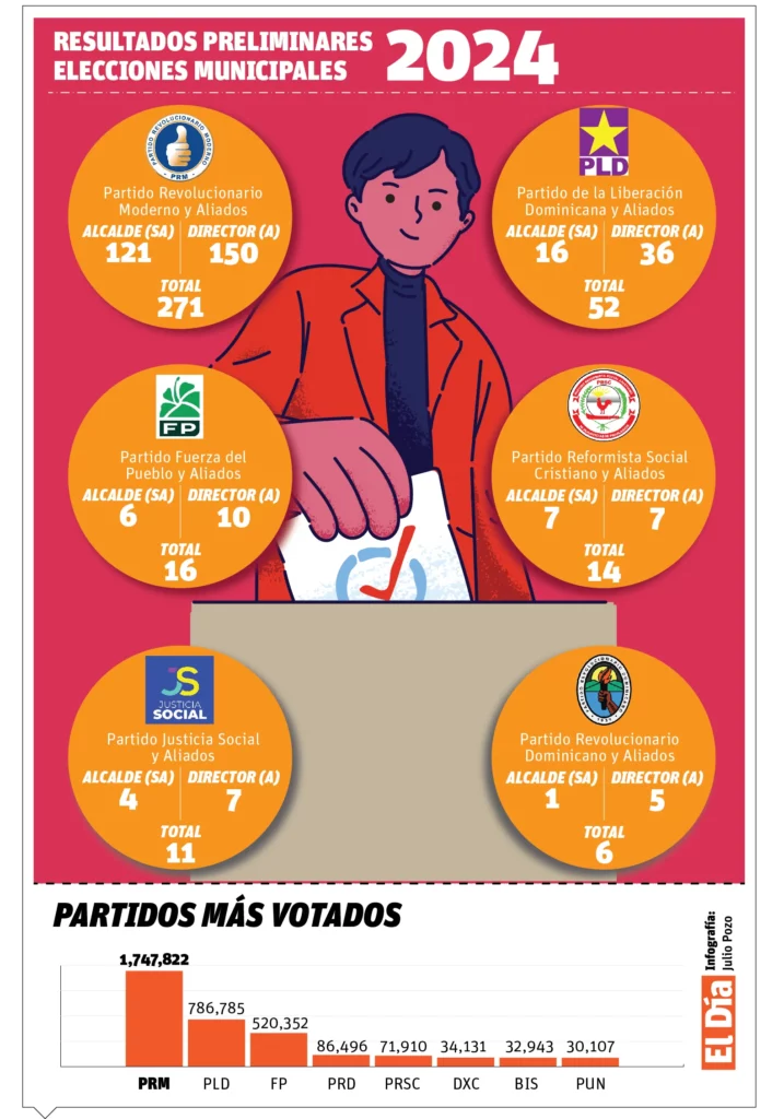 El PRM se queda con 121 alcaldes, 150 directores de distritos municipales y 1,747,822 votos.