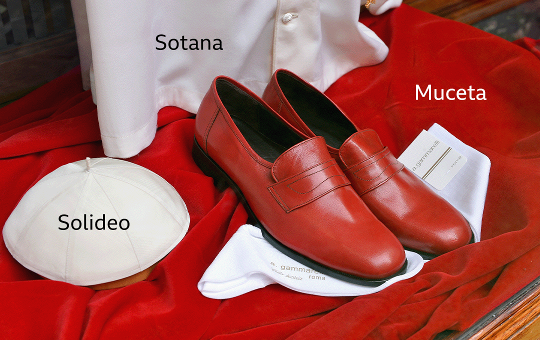 Después de anunciar su nuevo nombre, el papa es trasladado a la llamada "Sala de las Lágrimas", una antesala de la Capilla Sixtina, donde se pone los atuendos papales y accesorios como la sotana blanca, una capa llamada muceta y un solideo blanco.